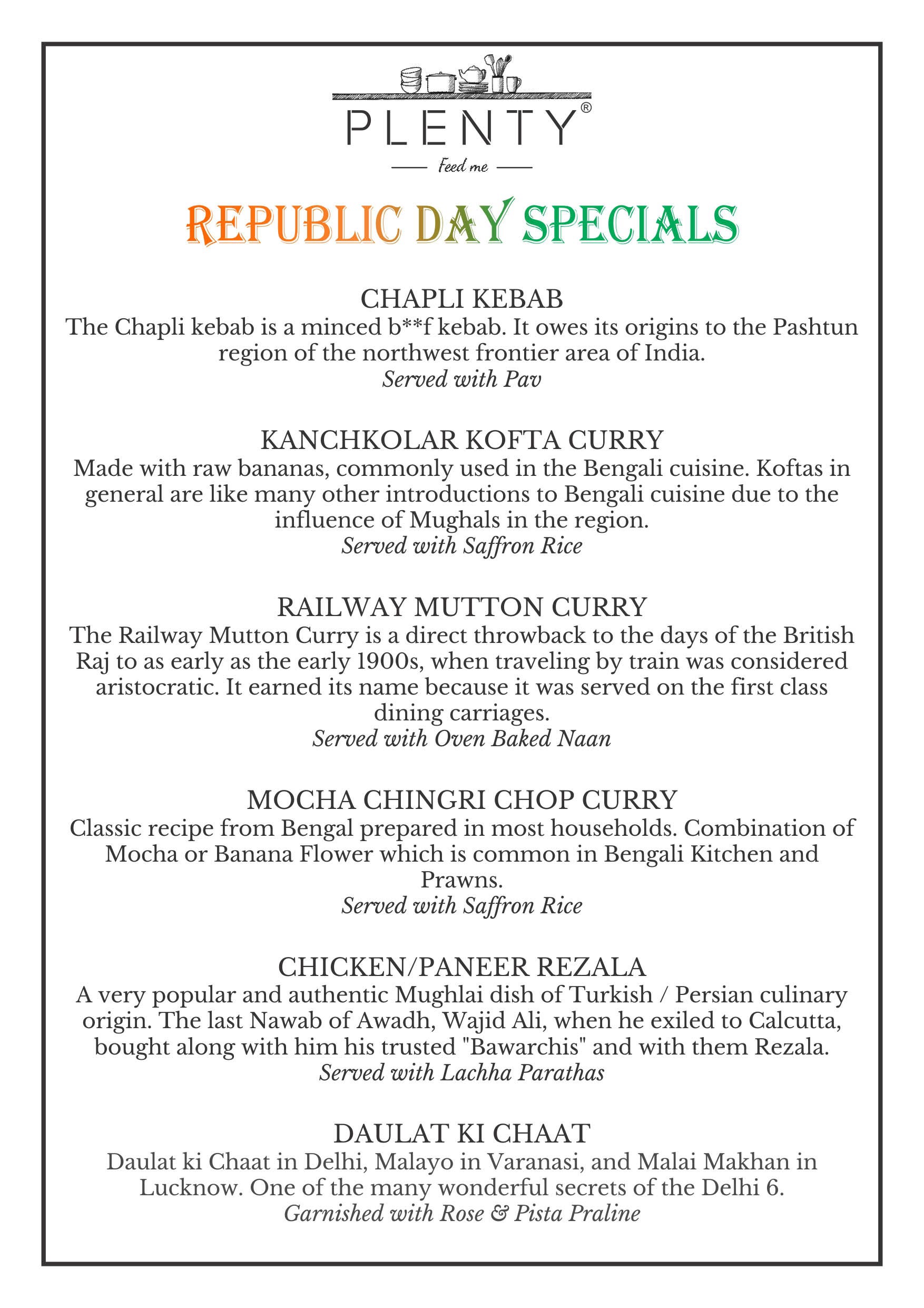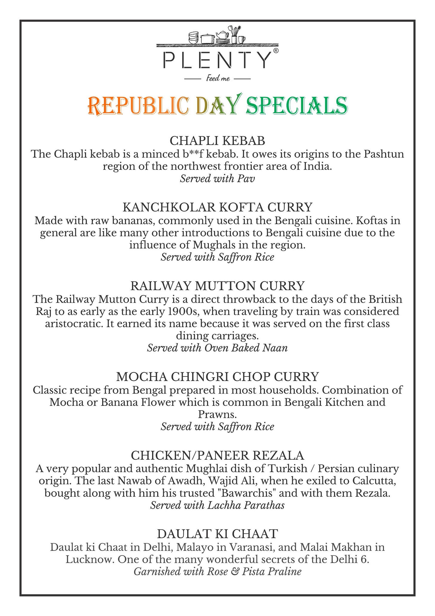 One year, on Republic Day we did a menu designed to celebrate regional favourites. It featured mix of various Indian cuisines and cultures - Bengali, Sindhi, Mangalorean, Awadhi and so much more.