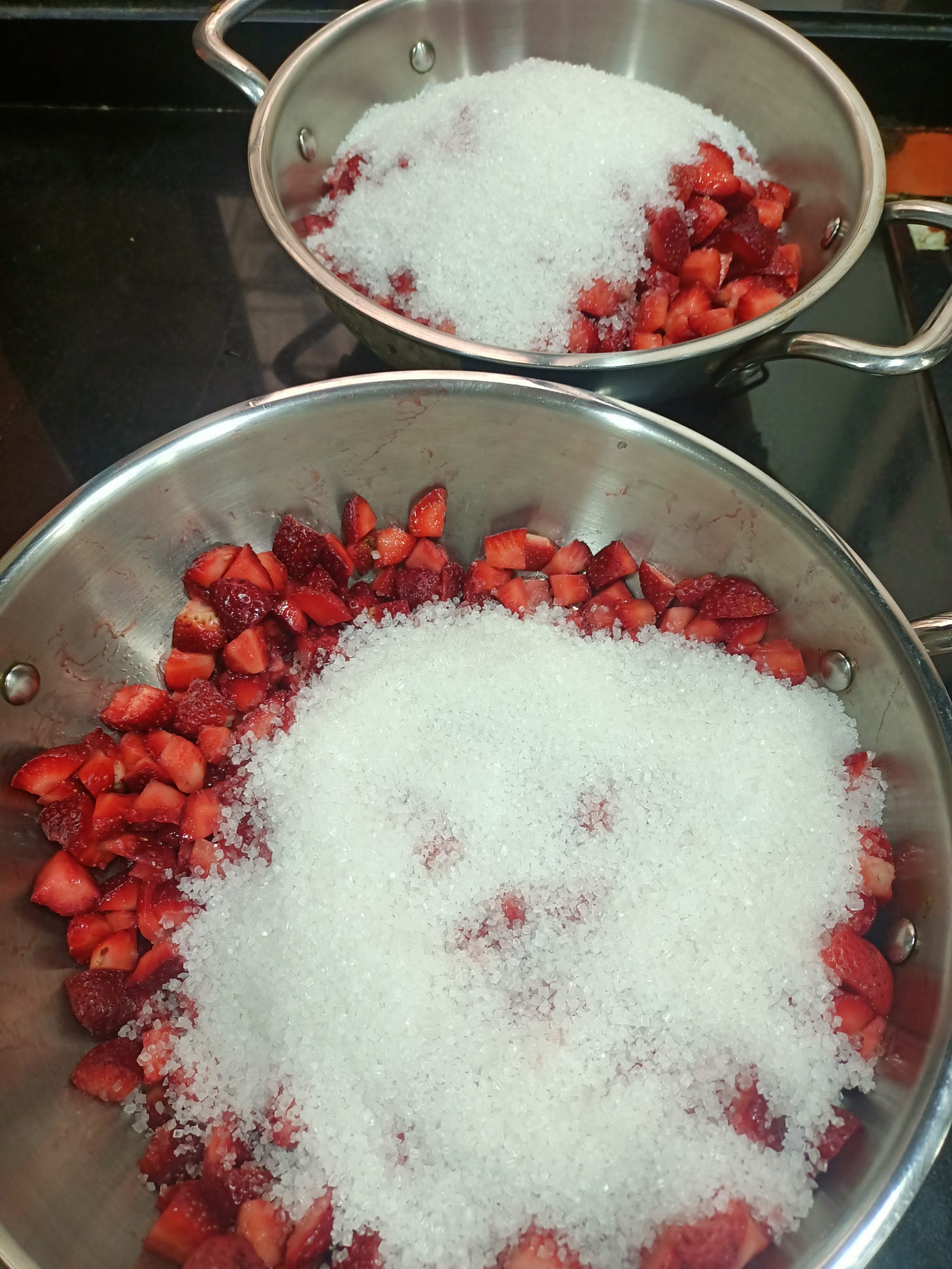 As my daughter would say when asked how many brownies I should make for the school fair, “LOTS AND LOTS” of strawberries are brought home. They are washed and cut into big chunks. They are blessed with lots and lots of sugar, along with some lemon juice, and the rest is left to the fire gods.